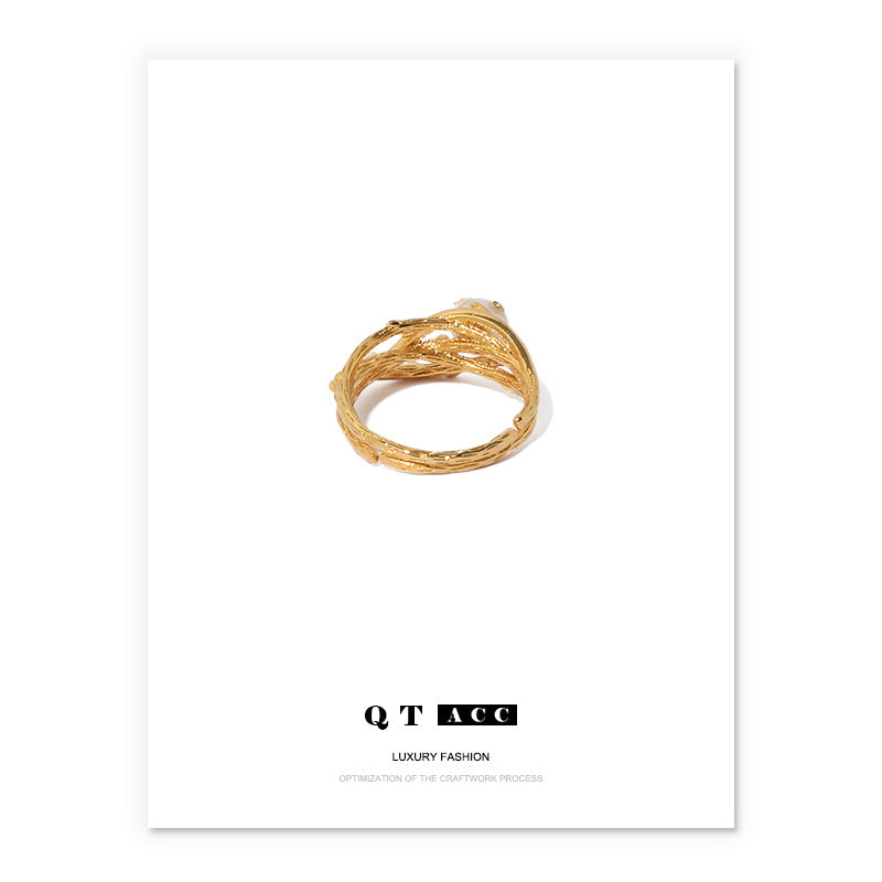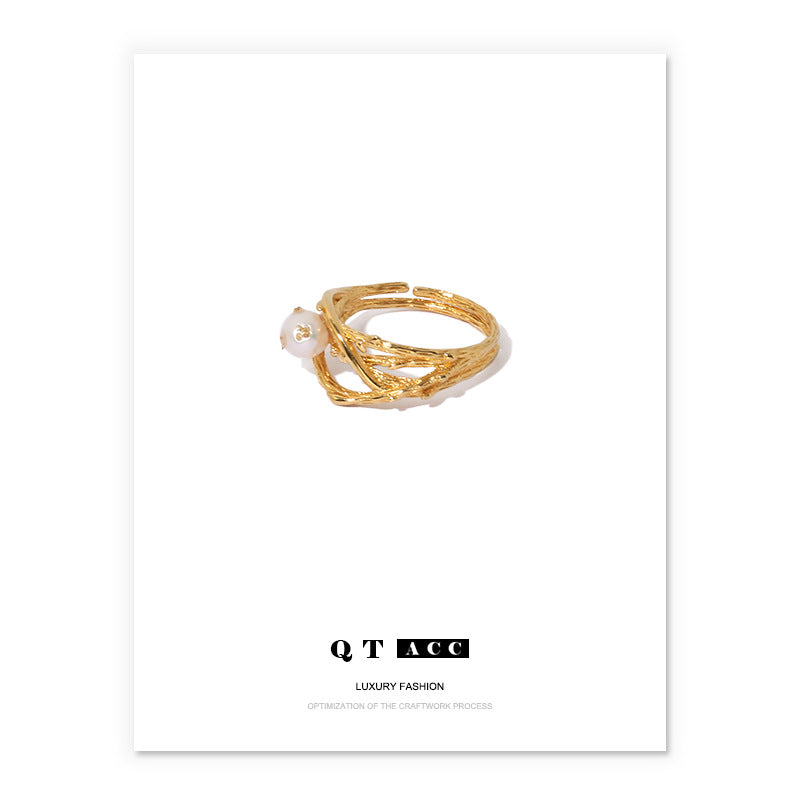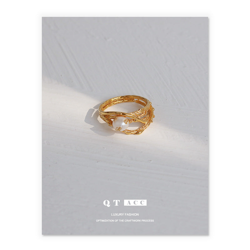 High color retention brass electroplated real gold/natural real pearl/gold foil, retro Internet celebrity bird's nest line jewelry ring
